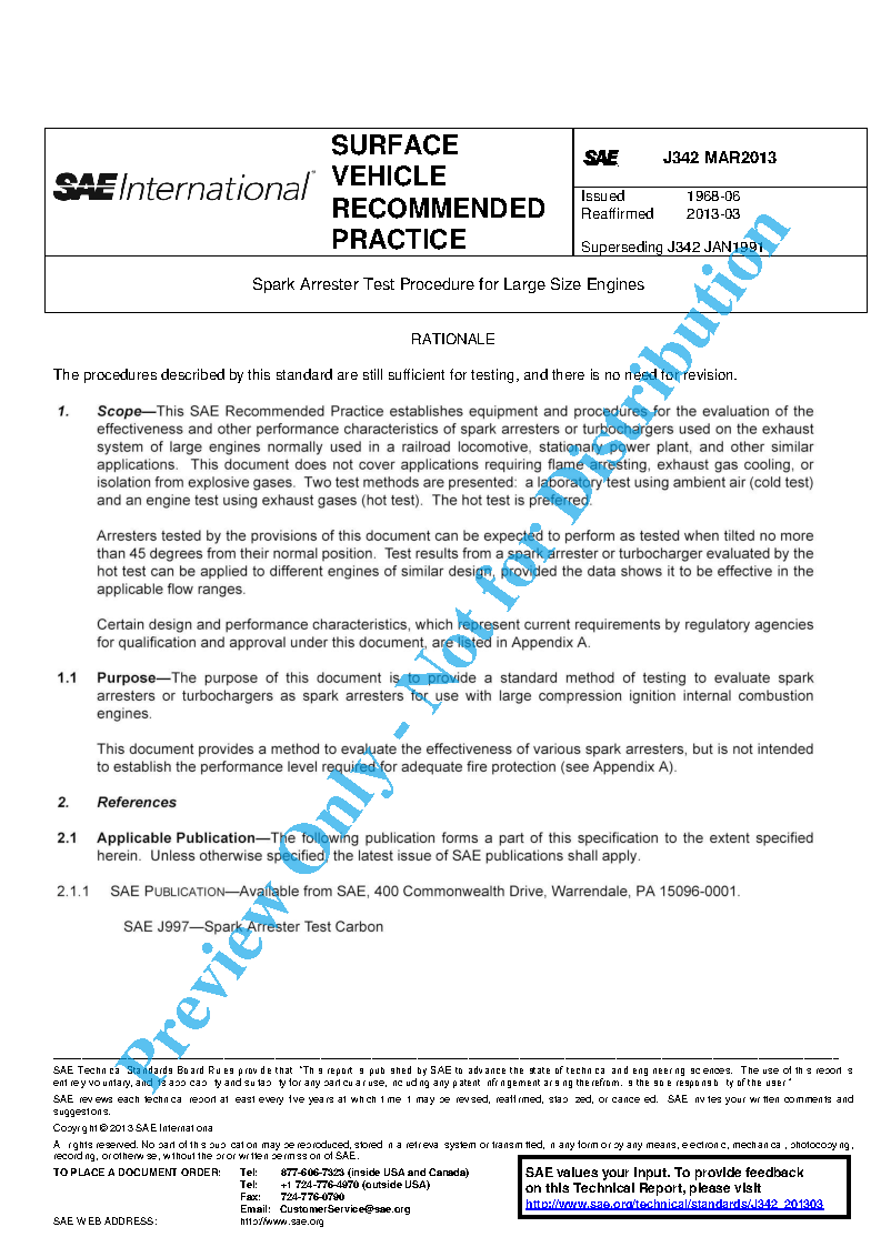 This SAE Recommended Practice establishes equipment and procedures for the evaluation of the effectiveness and other performance characteristics of spark arresters or turbochargers used on the exhaust system of large engines normally used in a railroad locomotive, stationary power plant, and other similar applications. This document does not cover applications requiring flame arresting, exhaust gas cooling, or isolation from explosive gases. Two test methods are presented: a laboratory test using ambient air (cold test) and an engine test using exhaust gases (hot test). The hot test is preferred.