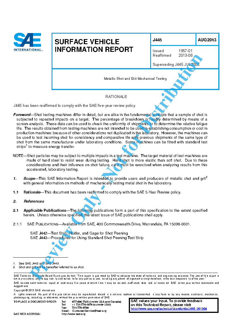 This SAE Information Report is intended to provide users and producers of metallic shot and grit 2 with general information on methods of mechanically testing metal shot in the laboratory.