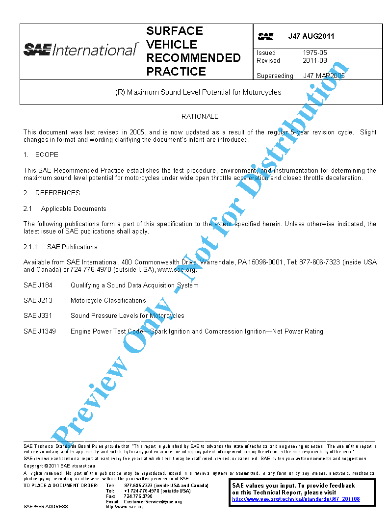 This SAE Recommended Practice establishes the test procedure, environment, and instrumentation for determining the maximum sound level potential for motorcycles under wide open throttle acceleration and closed throttle deceleration.