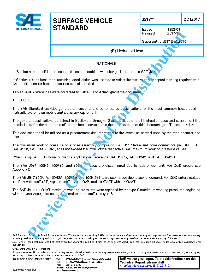 This SAE Standard provides general, dimensional and performance specifications for the most common hoses used in hydraulic systems on mobile and stationary equipment.