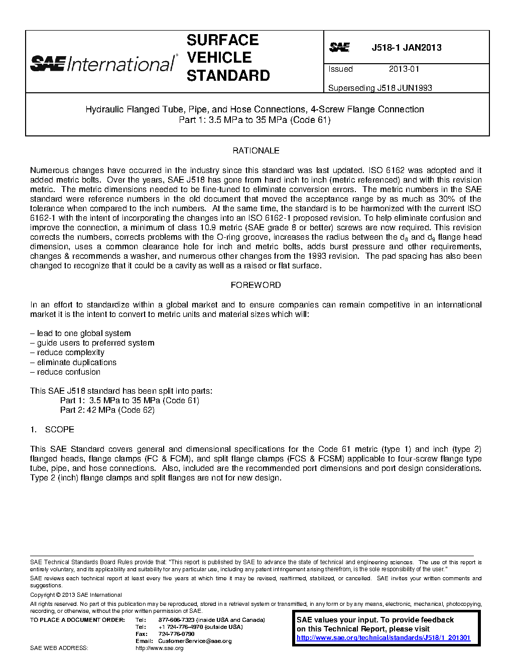 This SAE Standard covers general and dimensional specifications for the Code 61 metric (type 1) and inch (type 2) flanged heads, flange clamps (FC & FCM), and split flange clamps (FCS & FCSM) applicable to four-screw flange type tube, pipe, and hose connections. Also, included are the recommended port dimensions and port design considerations. Type 2 (inch) flange clamps and split flanges are not for new design.