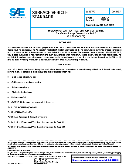 This SAE Standard covers general and dimensional specifications for the Code 62 metric (type 1) and inch (type 2) flanged heads, flange clamps (FC and FCM), and split flange clamps (FCS and FCSM) applicable to four-screw flange type tube, pipe, and hose connections. Also included are the recommended port dimensions and port design considerations. Type 2 (inch) flange clamps and split flanges are not for new design.