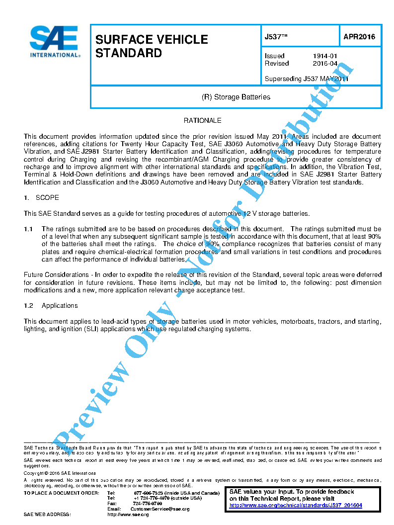This SAE Standard serves as a guide for testing procedures of automotive 12 V storage batteries.
