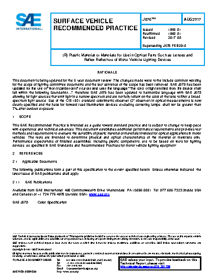 This SAE Recommended Practice is intended as a guide toward standard practice and is subject to change to keep pace with experience and technical advances. This document establishes additional performance requirements and provides test methods and requirements to evaluate the suitability of materials intended for optical applications in motor vehicles. The tests are intended to determine physical and optical characteristics of the materials only. Performance expectations of finished assemblies, including plastic components, are to be based on tests for lighting devices, as specified in SAE Standards and Recommended Practices for motor vehicle lighting equipment. Glass and materials inclusive to the light source are not in scope for this method.