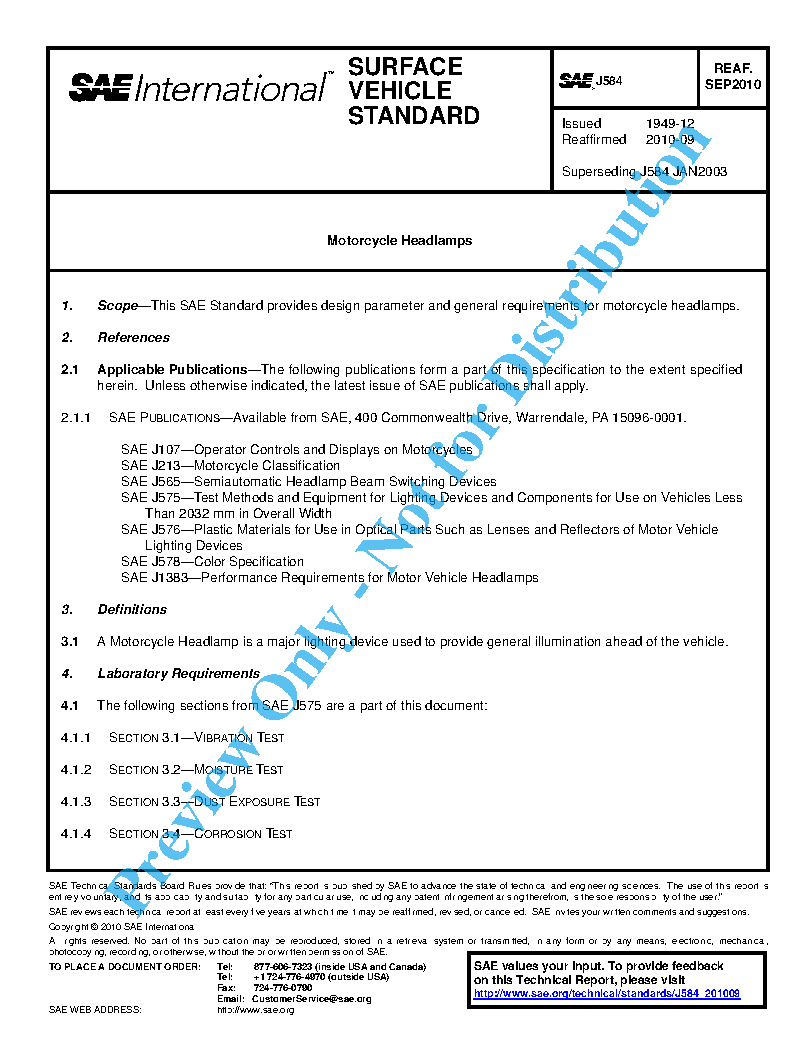 This SAE Standard provides design parameter and general requirements for motorcycle headlamps.