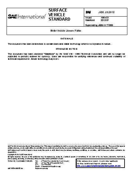 This SAE Standard establishes basic dimensions for motor vehicle license plates. It is based on data supplied by the American Association of Motor Vehicle Administrators, Motor Vehicle manufacturers Association, and Motorcycle, Scooter and Allied Trades Association. The dimensions established in this document have considered legibility and identification of the license plate.