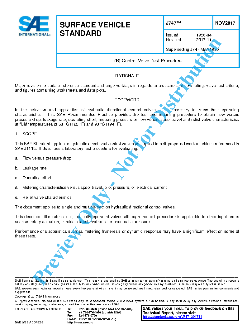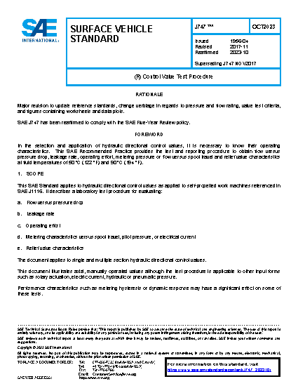 This SAE Standard applies to hydraulic directional control valves as applied to self-propelled work machines referenced in SAE J1116. It describes a laboratory test procedure for evaluating: