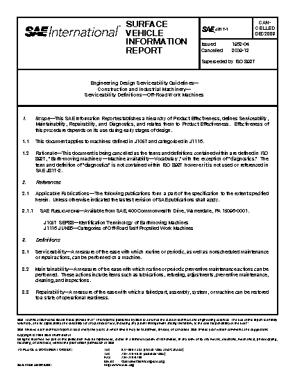This SAE Information Report establishes a hierarchy of Product Effectiveness, defines Serviceability, Maintainability, Repairability, and Diagnostics, and relates them to Product Effectiveness. Effectiveness of this procedure depends on its use during early stages of design. This document applies to machines defined in J1057 and categorized in J1116.