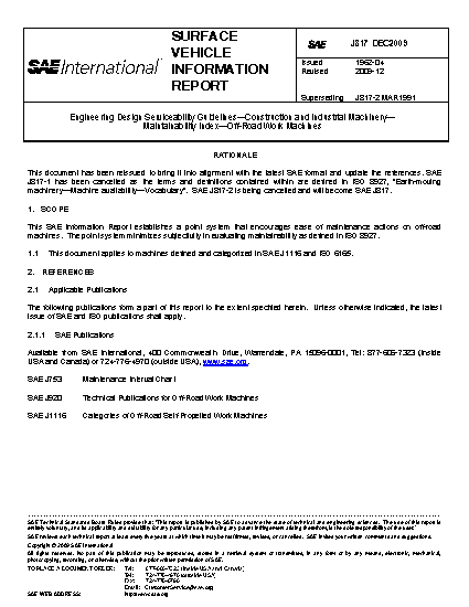 This SAE Information Report establishes a point system that encourages ease of maintenance actions on off-road machines. The point system minimizes subjectivity in evaluating maintainability as defined in ISO 8927.