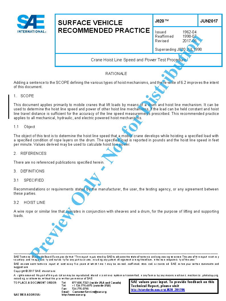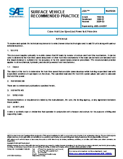 This document applies primarily to mobile cranes that lift loads by means of a drum and hoist line mechanism. It can be used to determine the hoist line speed and power of other hoist line mechanisms if the load can be held constant and hoist line travel distance is sufficient for the accuracy of the line speed measurements prescribed. This recommended practice applies to all mechanical, hydraulic, and electric powered hoist mechanisms.