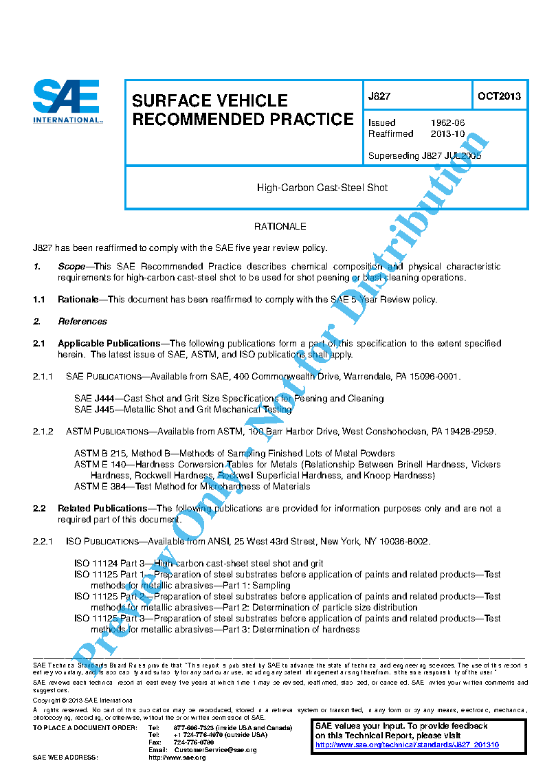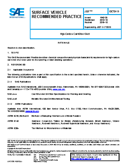 This SAE Recommended Practice describes chemical composition and physical characteristic requirements for high-carbon cast-steel shot to be used for shot peening or blast cleaning operations.