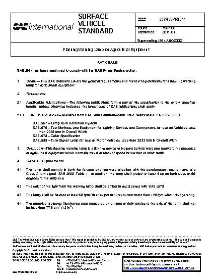 This SAE Standard covers the general requirements and the test requirements for a flashing warning lamp for agricultural equipment.