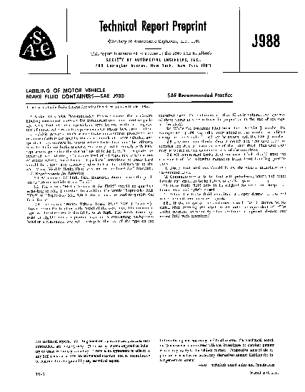 This SAE Recommended Practice covers the minimum labeling considered necessary for commercial containers used to package brake fluids of the nonpetroleum type for use in the braking system of motor vehicles such as passenger cars, trucks, buses, and trailers. The vehicle manufacturer’s service brake maintenance procedures are recommendations for specific makes or models of motor vehicles, and specified requirements for motor vehicle brake fluid must be followed in order to insure brake efficiency and safety, and to comply with legal regulations governing the sale and use of brake fluid. To designate the intended use and the performance level of all types and specifications of motor vehicle brake fluids, all packaged containers of brake fluid should be clearly and distinctly identified as to conformance to the SAE Motor Vehicle Brake Fluid specified in the latest SAE Standard.