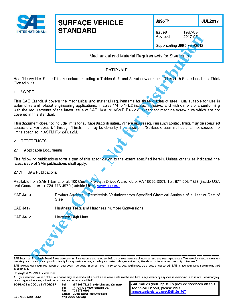 This SAE Standard covers the mechanical and material requirements for three grades of steel nuts suitable for use in automotive and related engineering applications, in sizes 1/4 to 1-1/2 inches, inclusive, and with dimensions conforming with the requirements of the latest issue of SAE J482 or ASME B18.2.2, except for machine screw nuts which are not covered in this standard.
