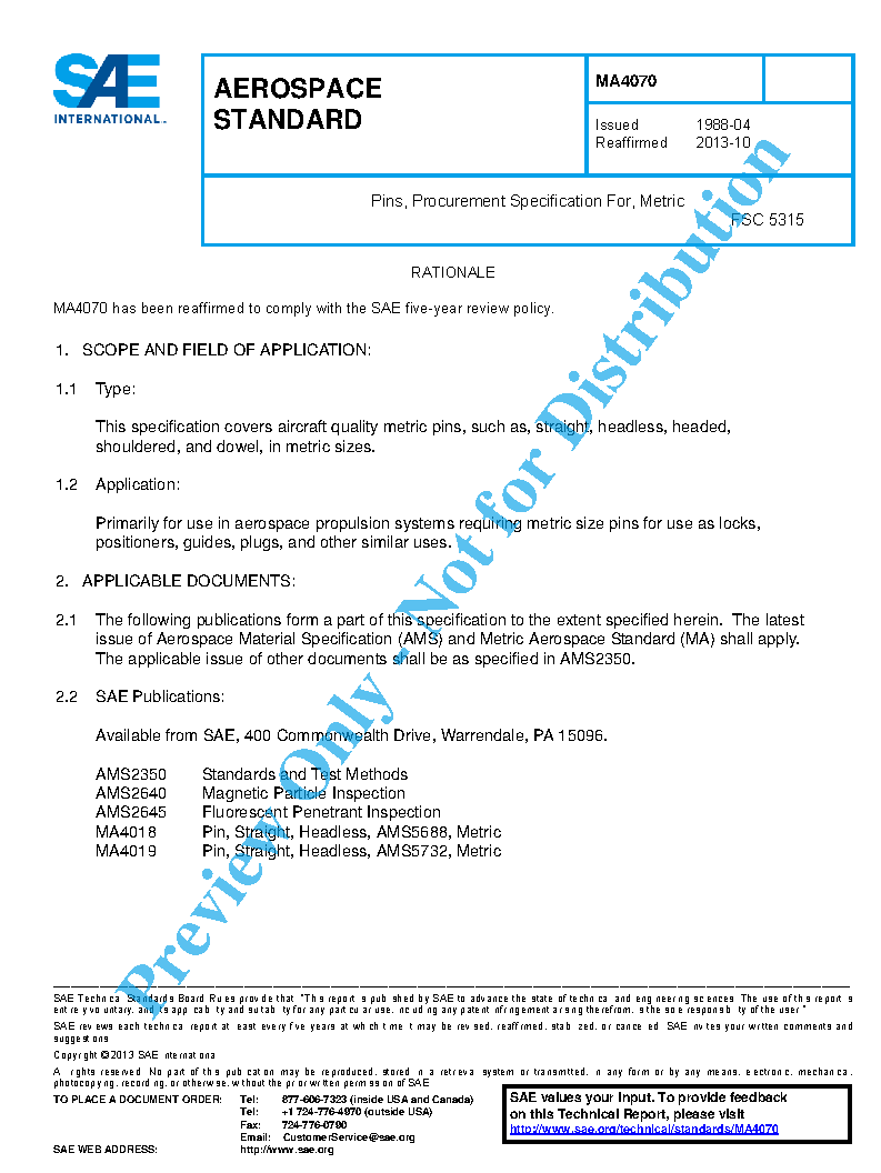 This specification covers aircraft quality metric pins, such as straight, headless, headed, shouldered, and dowel, in metric sizes.