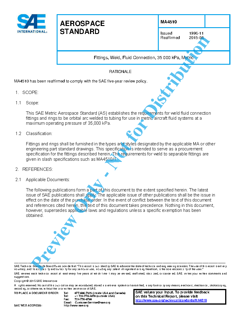 This SAE Metric Aerospace Standard (AS) establishes the requirements for weld fluid connection fittings and rings to be orbital arc welded to tubing for use in metric aircraft fluid systems at a maximum operating pressure of 35,000 kPa.