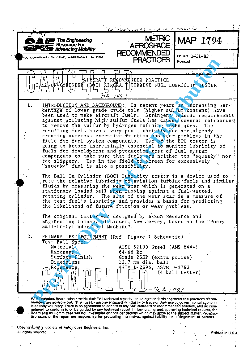 Aircraft Recommended Practice, Ball-On-Cylinder (Boc) Aircraft Turbine Fuel Lubricity Tester