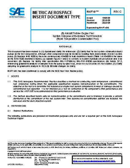 This SAE Aerospace Recommended Practice describes a method for conducting room temperature, contaminated fuel, endurance testing when the applicable specification requires nonrecirculation of the contaminants. The objective of the test is to determine the resistance of engine fuel system components to wear or damage caused by contaminated fuel operation. It is not intended as a test for verification of the component's filter performance and service life. ARP1827 is recommended for filter performance evaluation.