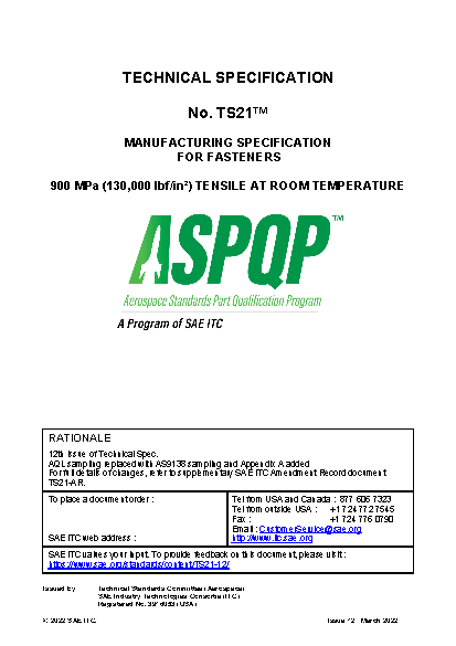 This technical specification document describes tests that certain parts may be required to meet. For example, this tech spec applies to A286 Stainless Bolts All Diameters All Heads/Shanks/Lengths and AS24700-799. To view suppliers qualified against this standard, visit https://ts200.sae-itc.org/.