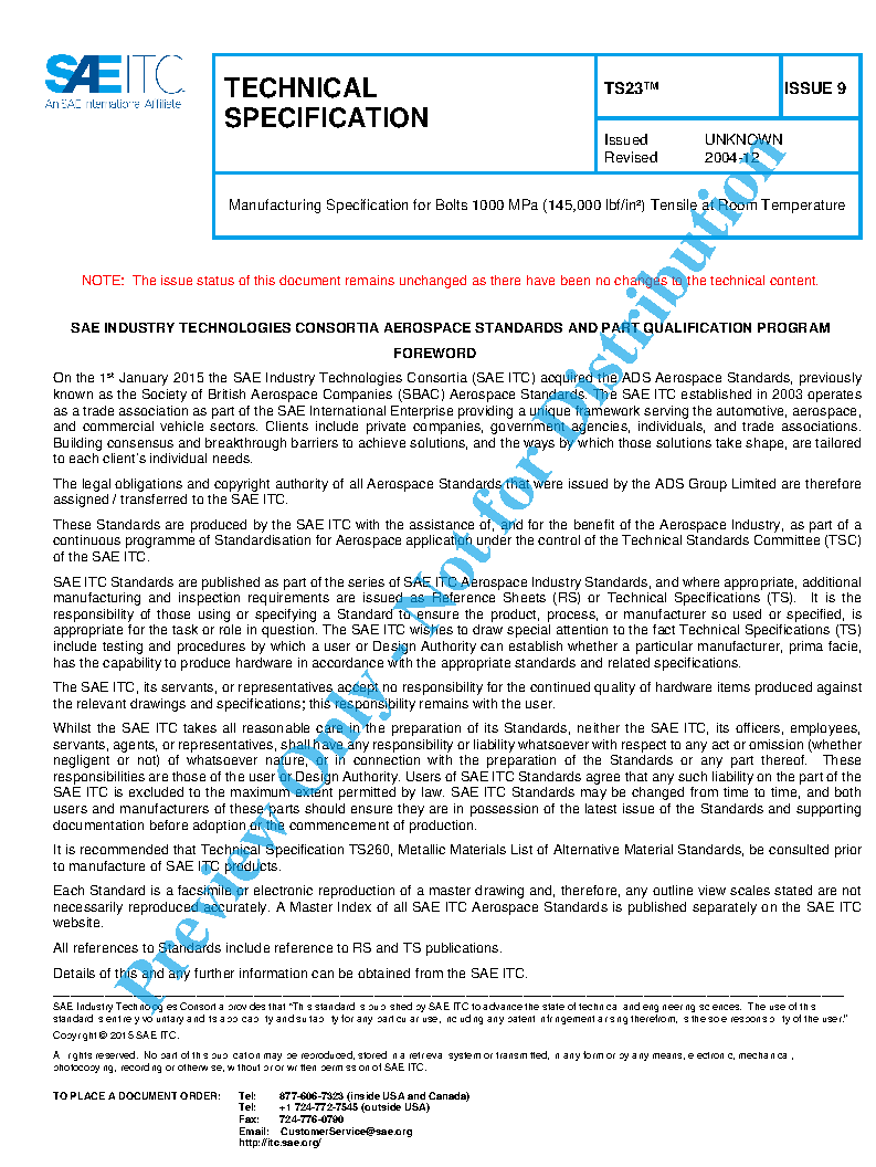 TS23 Manufacturing Specification for Bolts 1000 MPa (145,000 lbf/in²) Tensile at Room Temperature