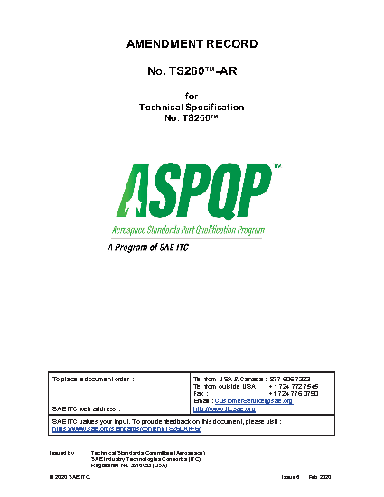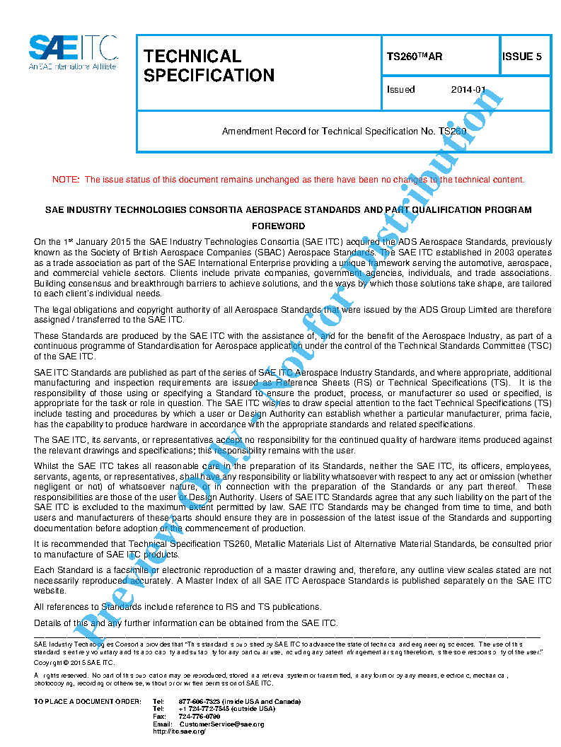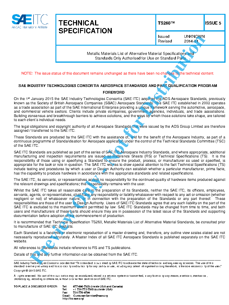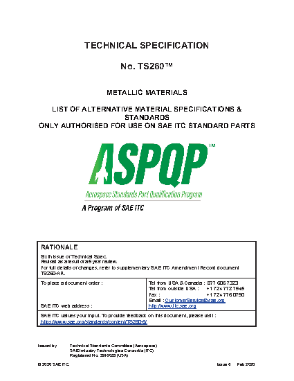 TS260 Metallic Materials List of Alternative Material Specifications and Standards Only Authorised for Use on Standard Parts