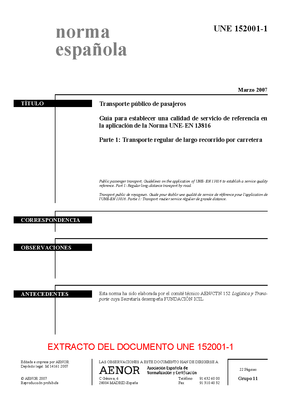 Public passenger transport. Guidelines on the application of UNE- EN 13816 to establish a service quality reference. Part 1: Regular long-distance transport by road.