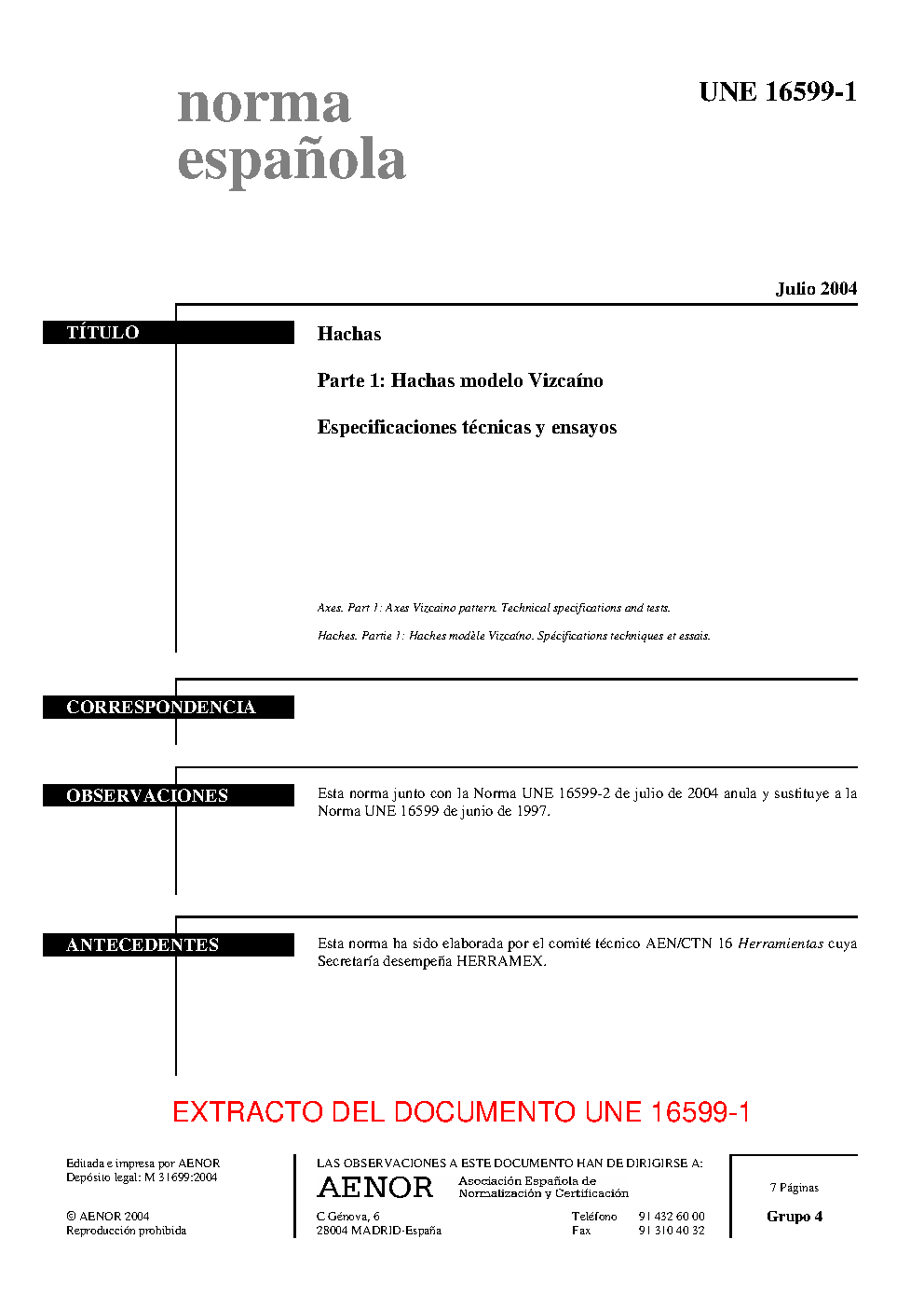 Axes. Part 1: Axes Vizcaino pattern.Technical specifications and tests.