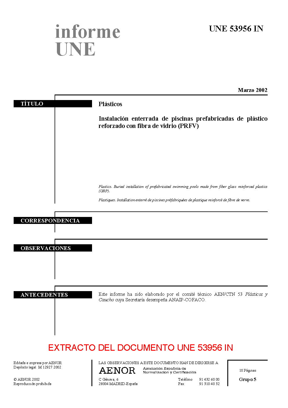 Plastics. Buried installation of prefabricated swimming pools made from fiber glass reinforced plastics (GRP).