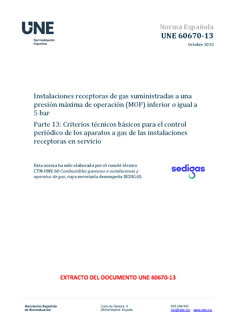 GAS INSTALLATIONS FOR DOMESTIC, COLLECTIVE OR COMMERCIAL PREMISES. PART 13: TECHNICAL CRITERIA FOR THE PERIODIC INSPECTION OF GAS APPLIANCES CONNECTED TO RECEIVING INSTALLATION IN SERVICE.