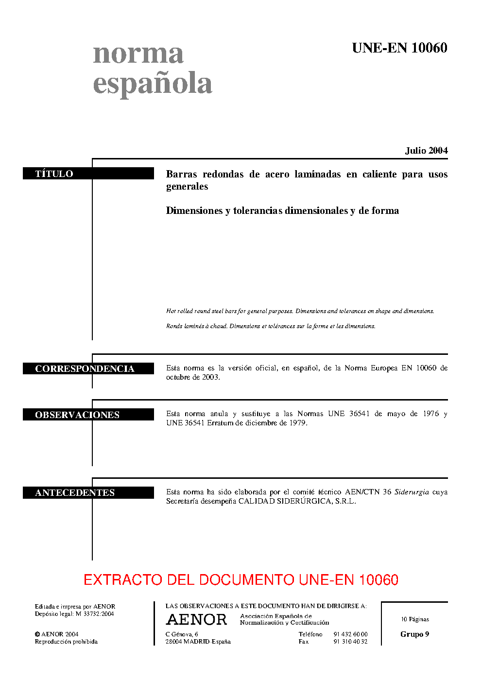 UNE-EN 10060:2004 (R2018)