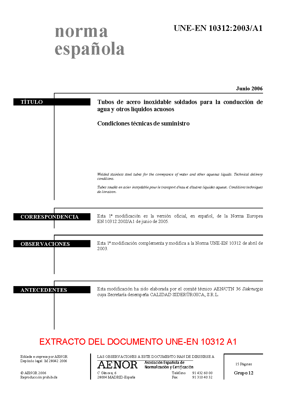 UNE-EN 10312:2003/A1:2006 (R2014)