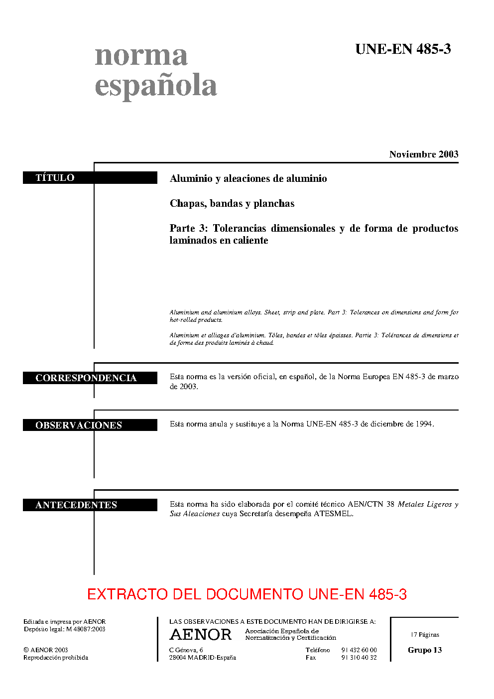 UNE-EN 485-3:2003 (R2019)