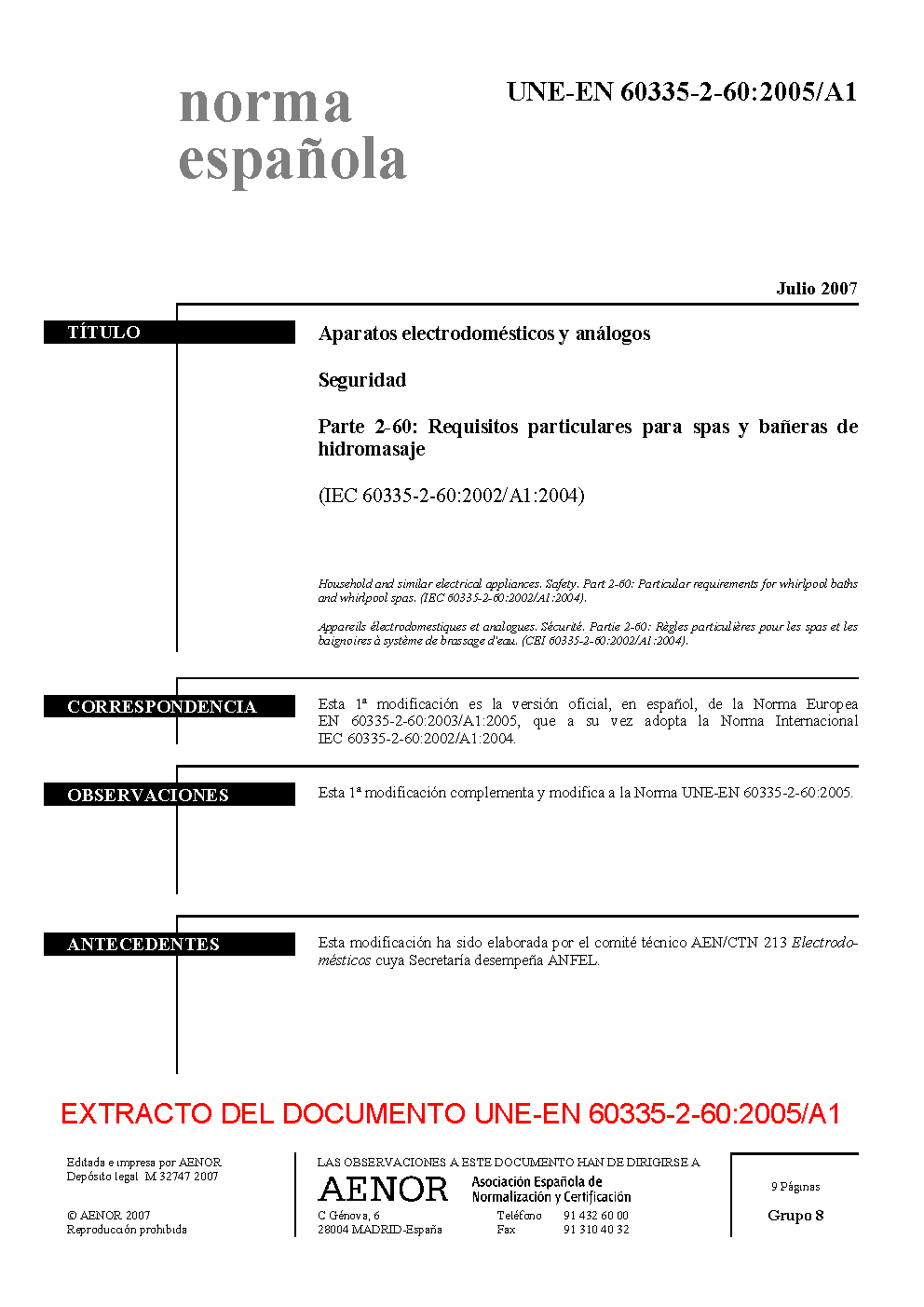Household and similar electrical appliances - Safety -- Part 2-60: Particular requirements for whirlpool baths and whirlpool spas (IEC 60335-2-60:2002/A1:2004).