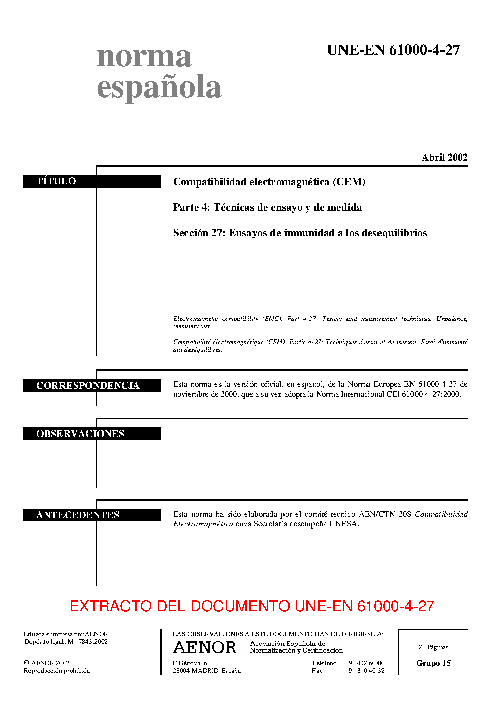 UNE-EN 61000-4-27:2002/A1:2009