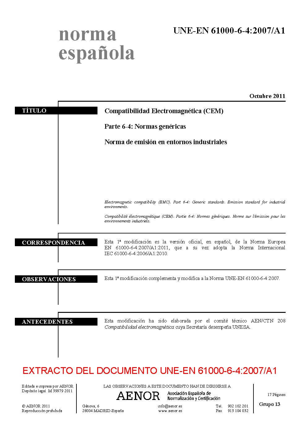 UNE-EN 61000-6-4:2007/A1:2011
