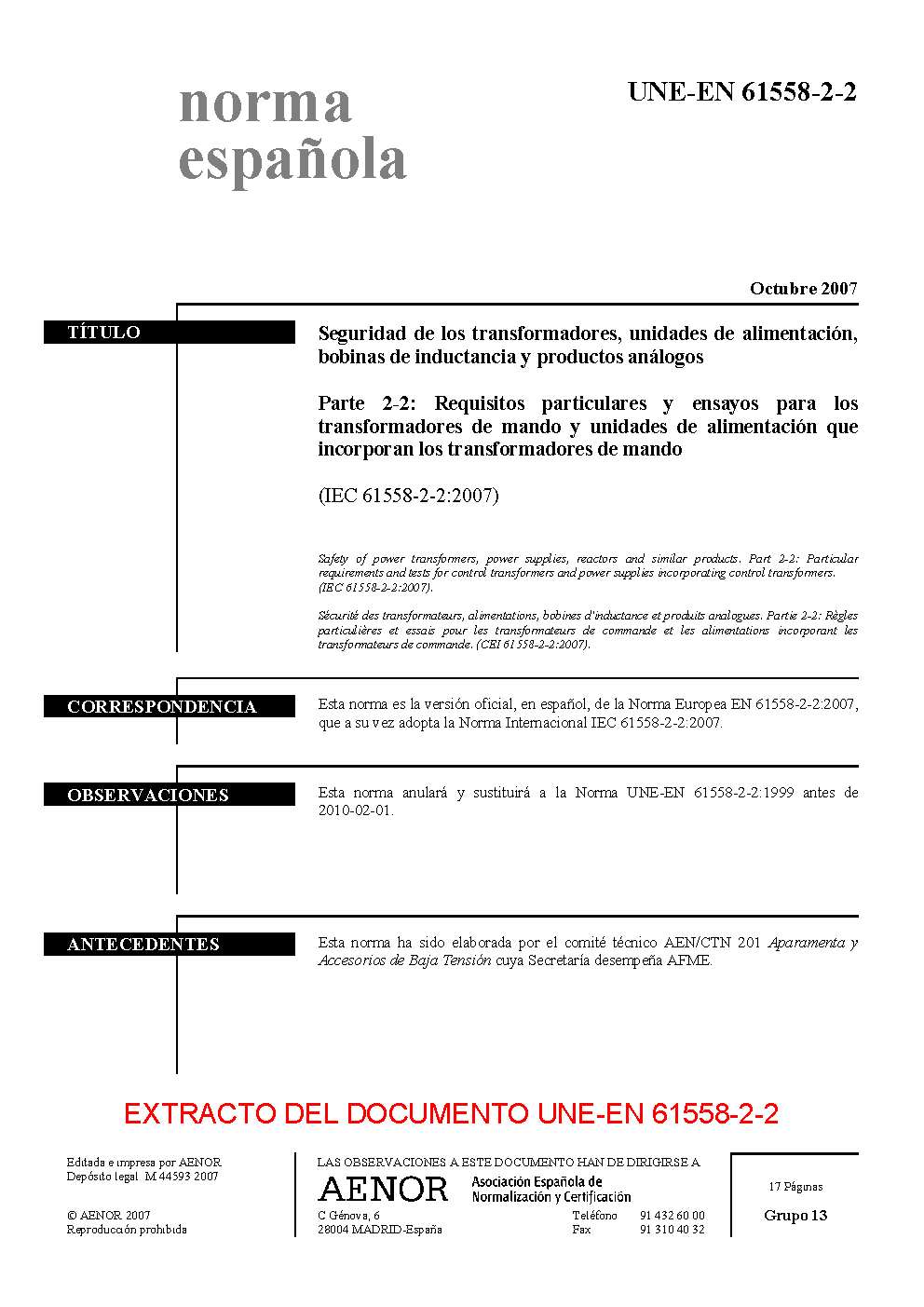 UNE-EN 61558-2-2:2007