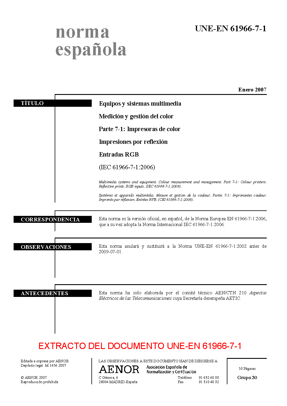 Multimedia systems and equipment - Colour measurement and management -- Part 7-1: Colour printers - Reflective prints - RGB inputs (IEC 61966-7-1:2006).