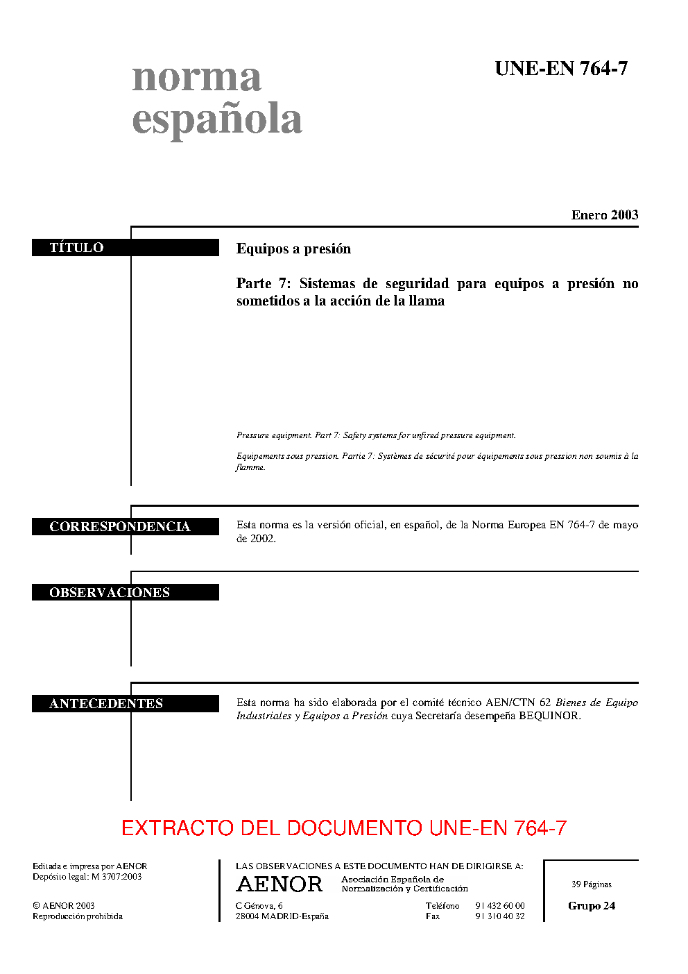 UNE-EN 764-7:2003 (R2014)
