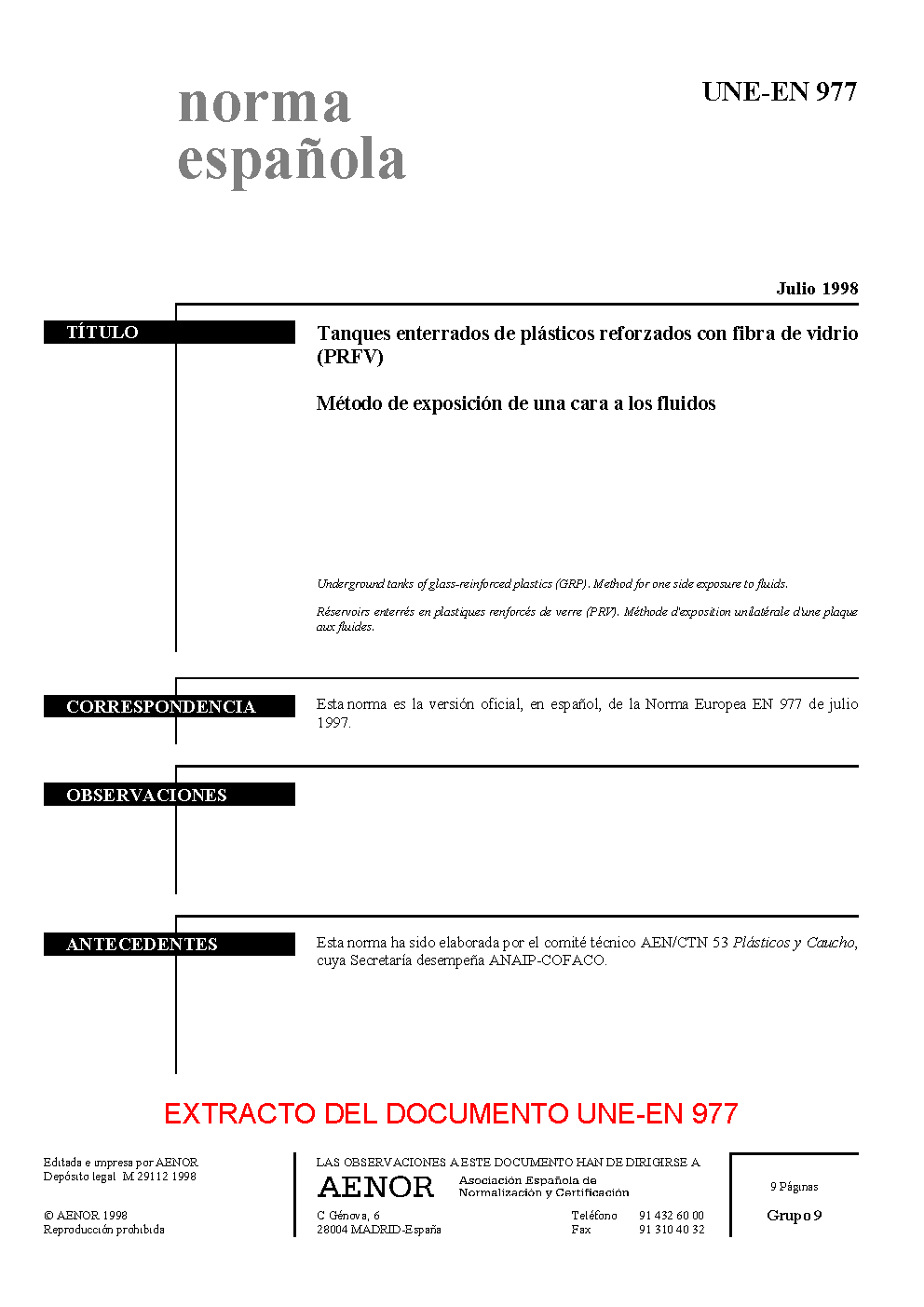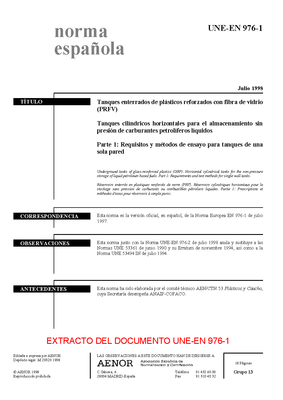 UNDERGROUND TANKS OF GLASS-REINFORCED PLASTICS (GRP). METHOD FOR ONE SIDE EXPOSURE TO FLUIDS.