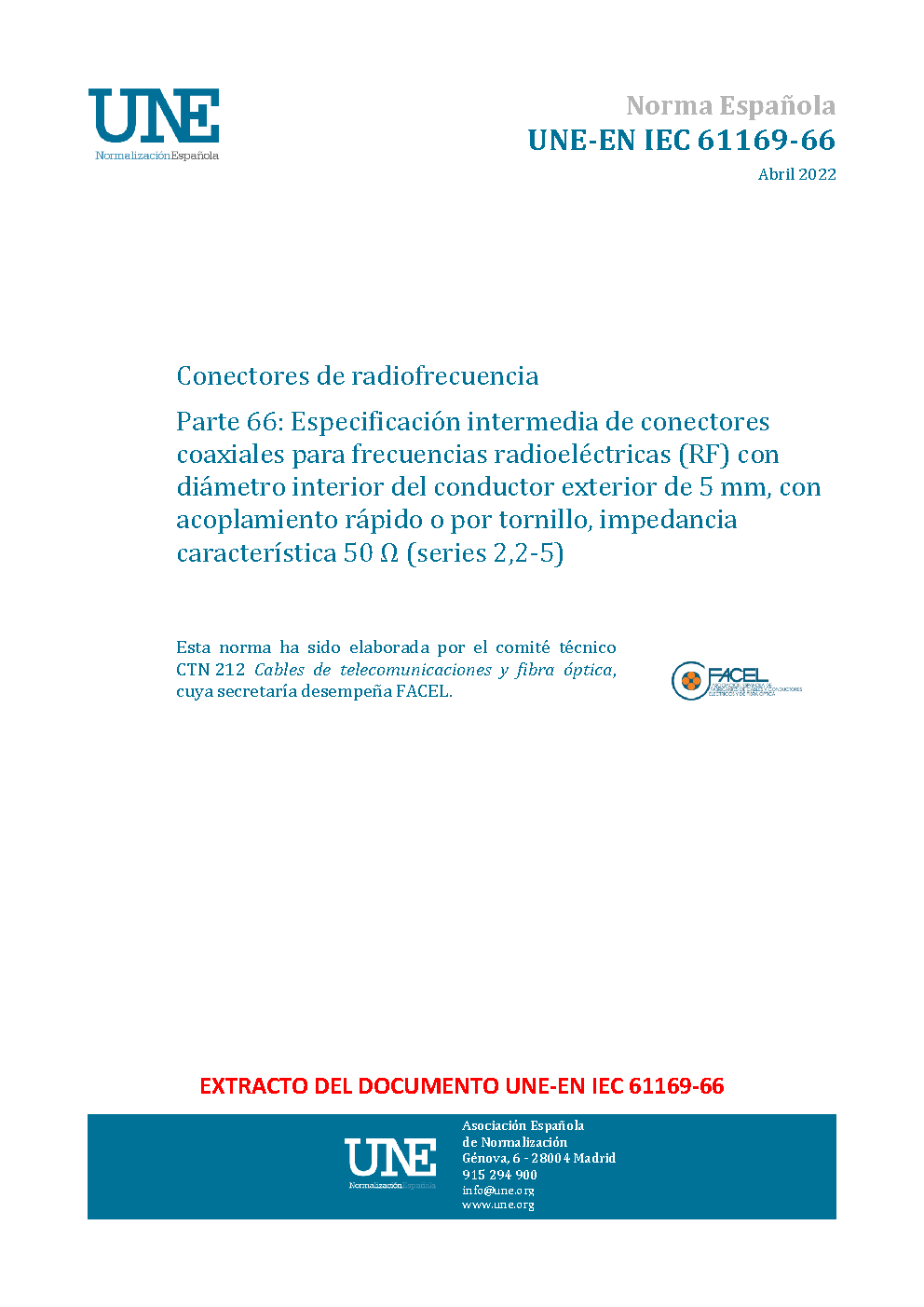 Radio-frequency connectors - Part 66: Sectional specification for RF coaxial connectors with 5 mm inner diameter of outer conductor, with quick-lock- or screw-coupling, characteristic impedance 50 O (series 2,2-5)