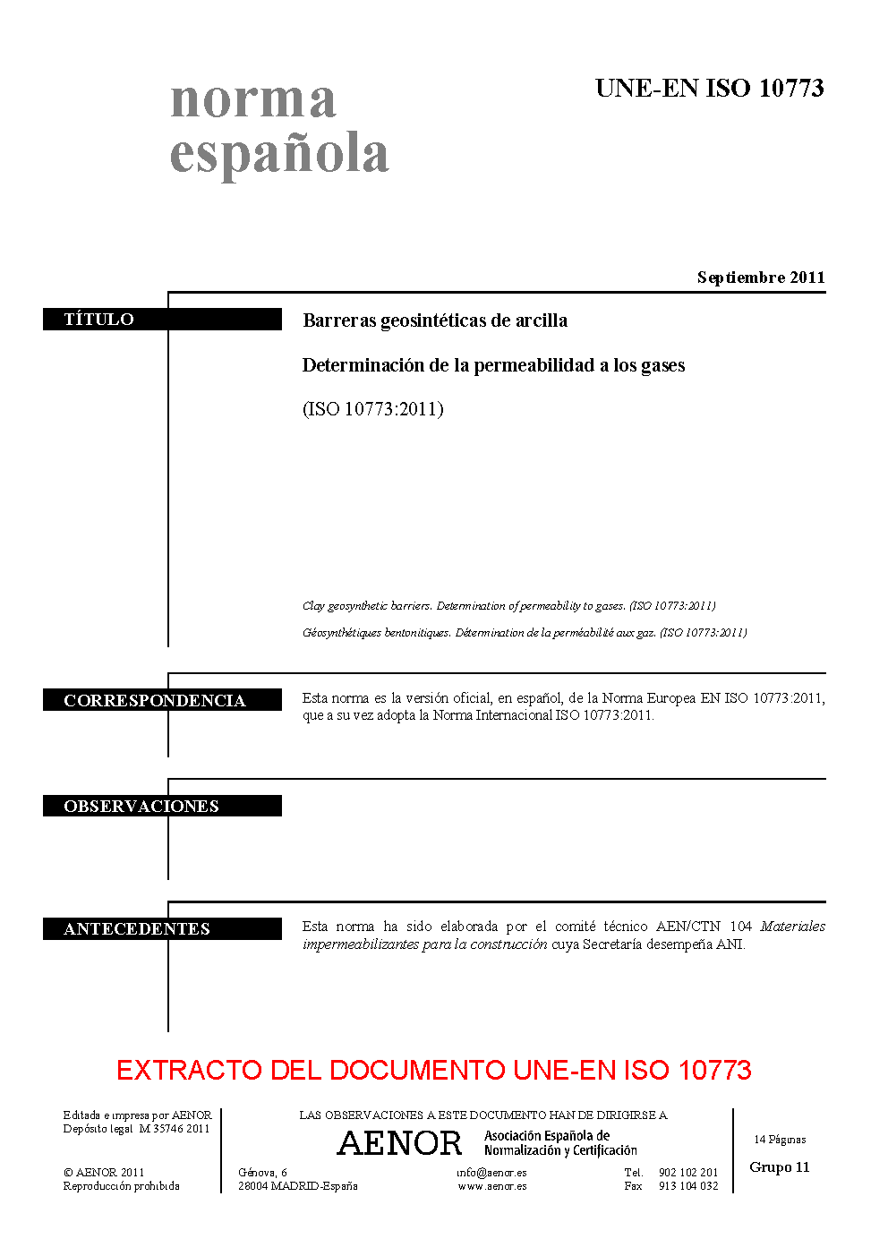Clay geosynthetic barriers - Determination of permeability to gases (ISO 10773:2011)