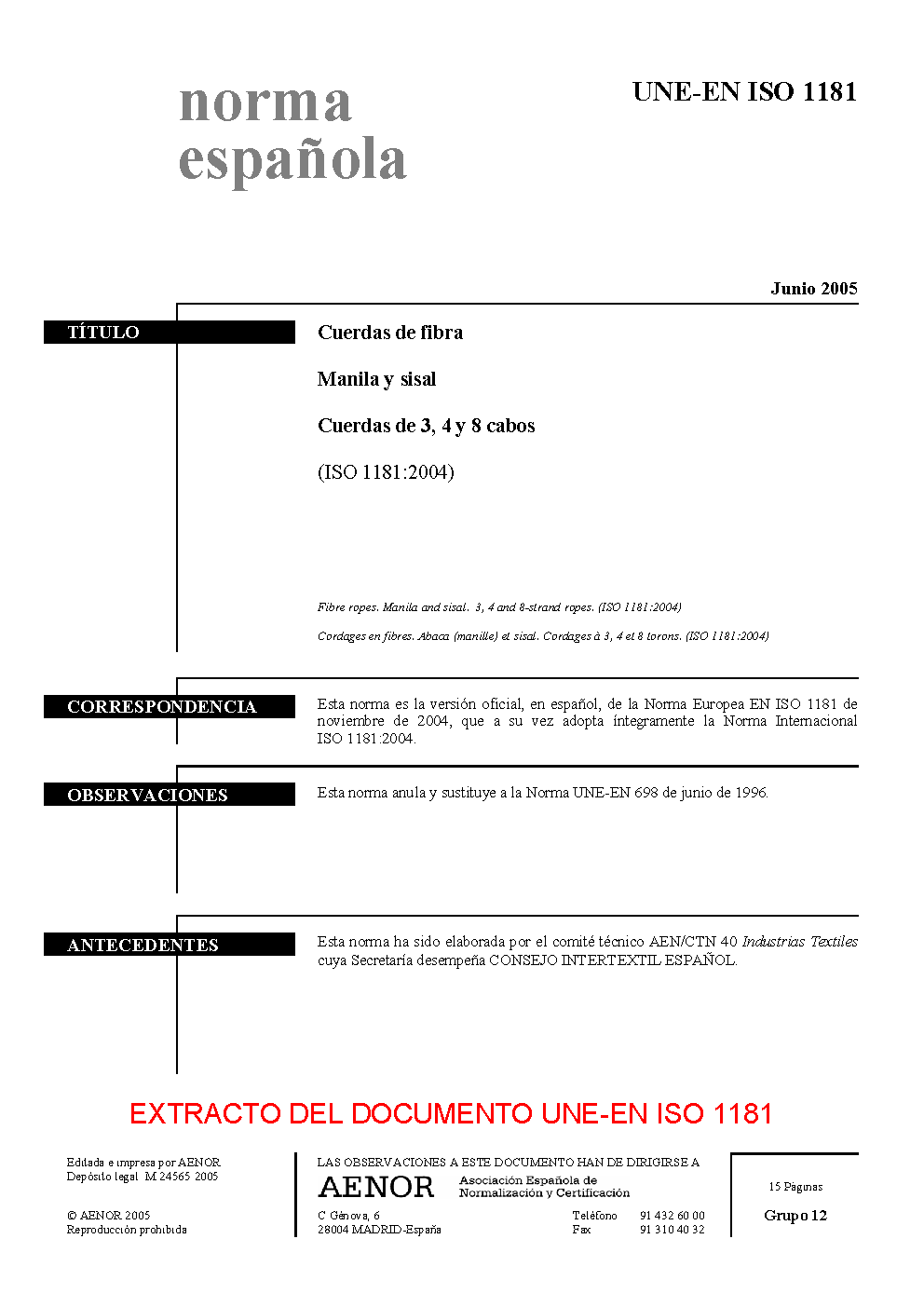 Fibre ropes - Manila and sisal. 3, 4 and 8-strand ropes (ISO 1181:2004)
