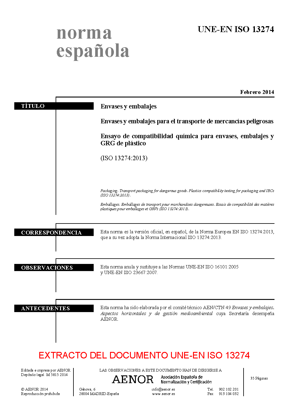 Packaging - Transport packaging for dangerous goods - Plastics compatibility testing for packaging and IBCs - Technical Corrigendum 1 (ISO 13274:2013/Cor 1:2014)
