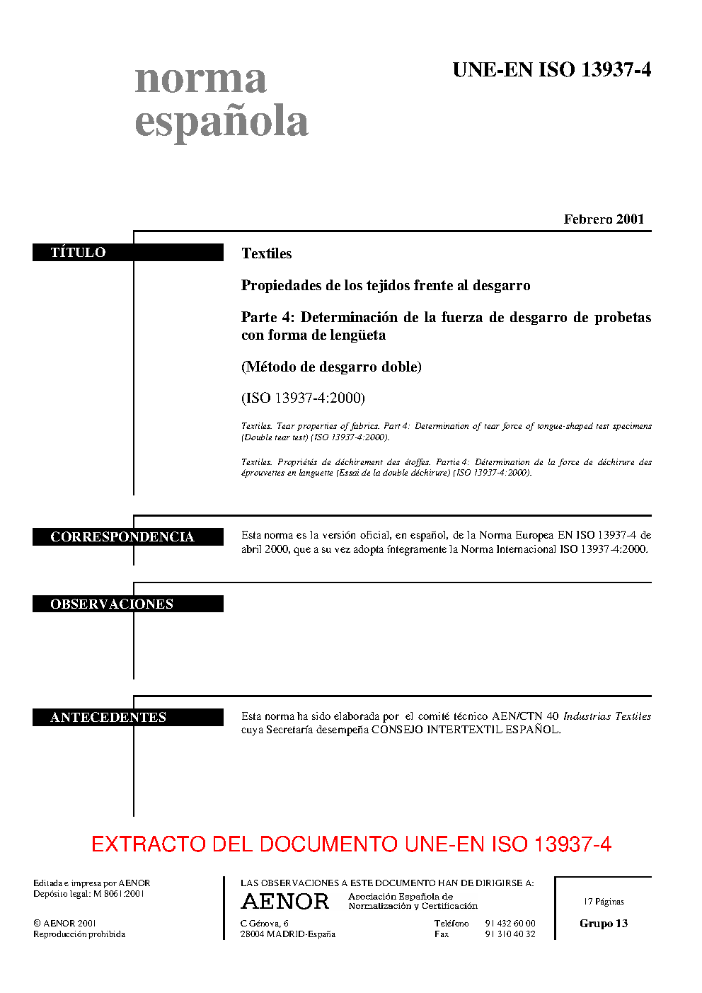 UNE-EN ISO 13937-4:2001 (R2010)