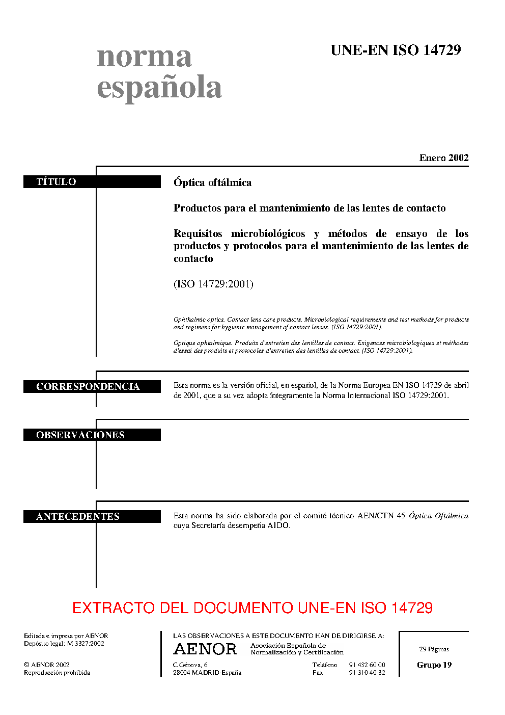 Ophthalmic optics - Contact lens care products - Microbiological requirements and test methods for products and regimens for hygienic management of contact lenses. (ISO 14729:2001)