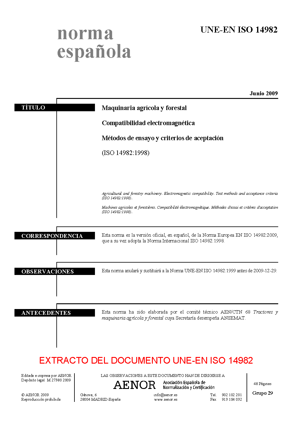 AGRICULTURAL AND FORESTRY MACHINES. ELECTROMAGNETIC COMPATIBILITY. TEST METHODS AND ACCEPTANCE CRITERIA. (ISO 14982:1998).