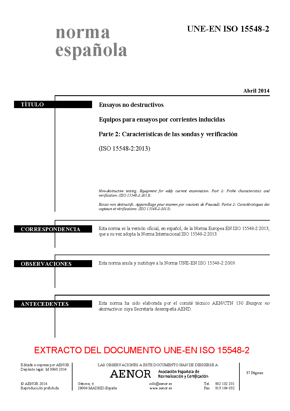 Non-destructive testing - Equipment for eddy current examination - Part 2: Probe characteristics and verification (ISO 15548-2:2013)