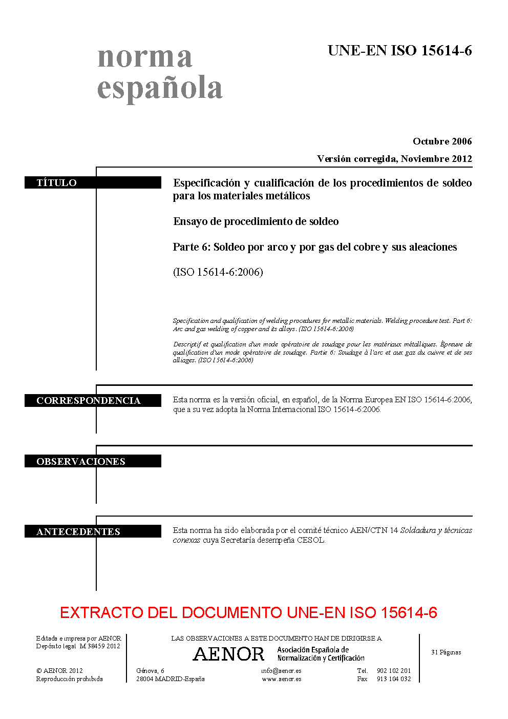 Specification and qualification of welding procedures for metallic materials - Welding procedure test - Part 6: Arc and gas welding of copper and its alloys (ISO 15614-6:2006)
