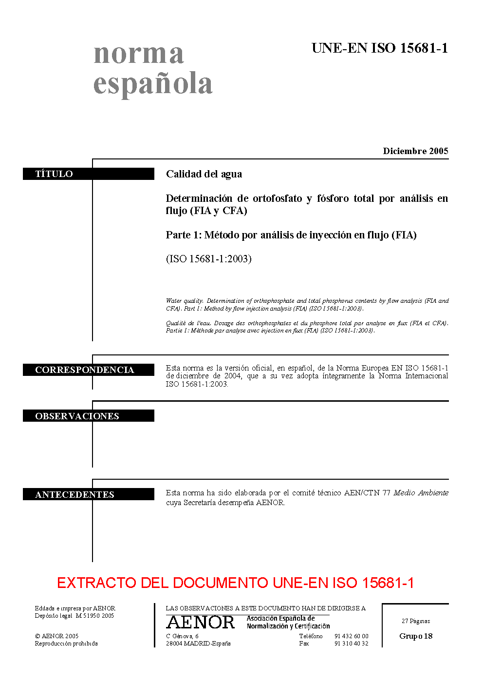 Water quality - Determination of orthophosphate and total phosphorus contents by flow analysis (FIA and CFA) - Part 1: Method by flow injection analysis (FIA) (ISO 15681-1:2003)