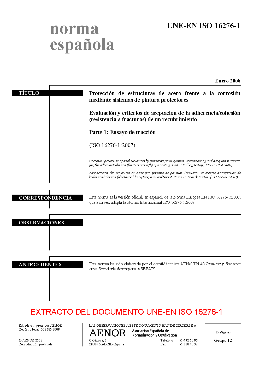 Corrosion protection of steel structures by protective paint systems - Assessment of, and acceptance criteria for, the adhesion/cohesion (fracture strength) of a coating - Part 1: Pull-off testing (ISO 16276-1:2007)